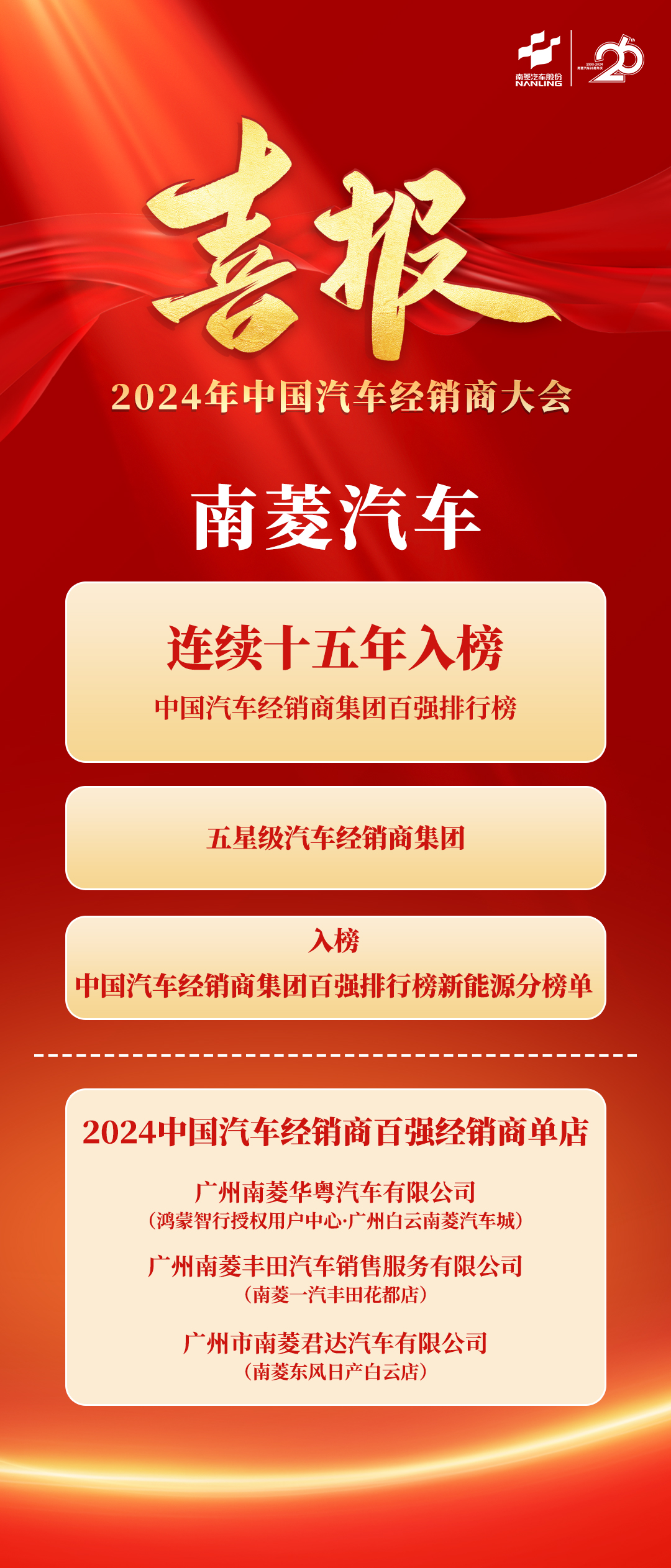 南菱汽车旗下广州南菱华粤汽车有限公司(鸿蒙智行授权用户中心·广州白云南菱汽车城)、广州南菱丰田汽车销售服务有限公司(南菱一汽丰田花都店)、广州市南菱君达汽车有限公司(南菱东风日产白云店)荣获“2024中国汽车经销商百强经销商单店”!